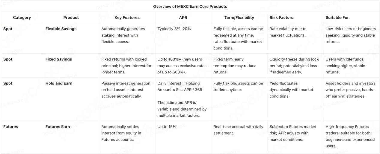 As mentioned above, providing users with a stable and sustainable source of returns amid market volatility has become a key factor in building long-term trust for exchanges. The MEXC Earn product ecosystem was developed in response to this need, prioritizing capital preservation, flexible liquidity, and controllable risk. It serves as both a defensive tool in bear markets and a liquidity reserve in preparation for bull markets.